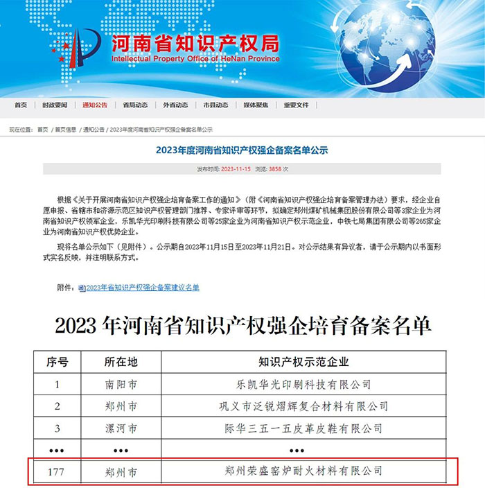 近日,河南省知識產(chǎn)權(quán)局公布2023年度河南省知識產(chǎn)權(quán)強企備案名單,鄭州榮盛窯爐耐火材料有限公司(以下簡稱「榮盛耐材」)榮獲「知識產(chǎn)權(quán)優(yōu)勢企業(yè)」稱號,知識產(chǎn)權(quán)綜合實力獲官方認(rèn)可。這是今年以來,榮盛耐材在知識產(chǎn)權(quán)領(lǐng)域獲得的又一項榮譽。