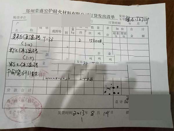 8月14日,鄭州榮盛耐材向?qū)幉ǹ蛻魷?zhǔn)時發(fā)貨,這次發(fā)出的產(chǎn)品主要包括1540塊密度為1.0的T-38莫來石保溫磚、1540塊密度為1.0的T-38粘土保溫磚、730塊T-3 粘土保溫磚和24箱1200*600*50的陶瓷纖維板。